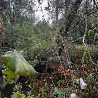 Even if it were legal to record on the road pavement, the visibility of sound recording alone is like a magnet of suspicious activity. Most field recordists can relate to this. Large, alien-looking boom mics pointing at people and things, strange recording boxes, headphones for listening (spying), signal a highly transgressive act to authority figures and security employees. Who can blame them? Ironically, as an occulocentric culture, iphone photos are somehow culturally acceptable. I tend to not to bother with being too confrontational with recording, as I do understand such places are also areas of national security. As a representative of Greenwich University, I am not on a guerilla mission as an artist. My entire practice is based on recording from the closest area on public footpaths, thus imposing a barrier to a direct access with waste. My positionality is from a distance on the acoustic horizon within the sphere of waste. Sometimes a footpath is along the edge of such facilities allowing for a more direct access. This was not the case here. Thinking I could get to the lake somehow was dashed as there was the geographical barrier of Colne Brook that I could not traverse. Here was my aural boundary. I took up a position at the bend of the brook just northwwest of Colnbrook West Lake. This is what the geographers call a liminal space. The area is partially enclosed by major motorways, the M25 and the M4. Not to mention its proximity ro Heathrow. Strangely, driving around we noticed or felt a sort of toxic "no grow" zone where trees looked stunted, if not outright dead. With the trailhead along the busy Colnbrook By Pass leading up to the brook, the signs of uncontainable discard were making their presence known.